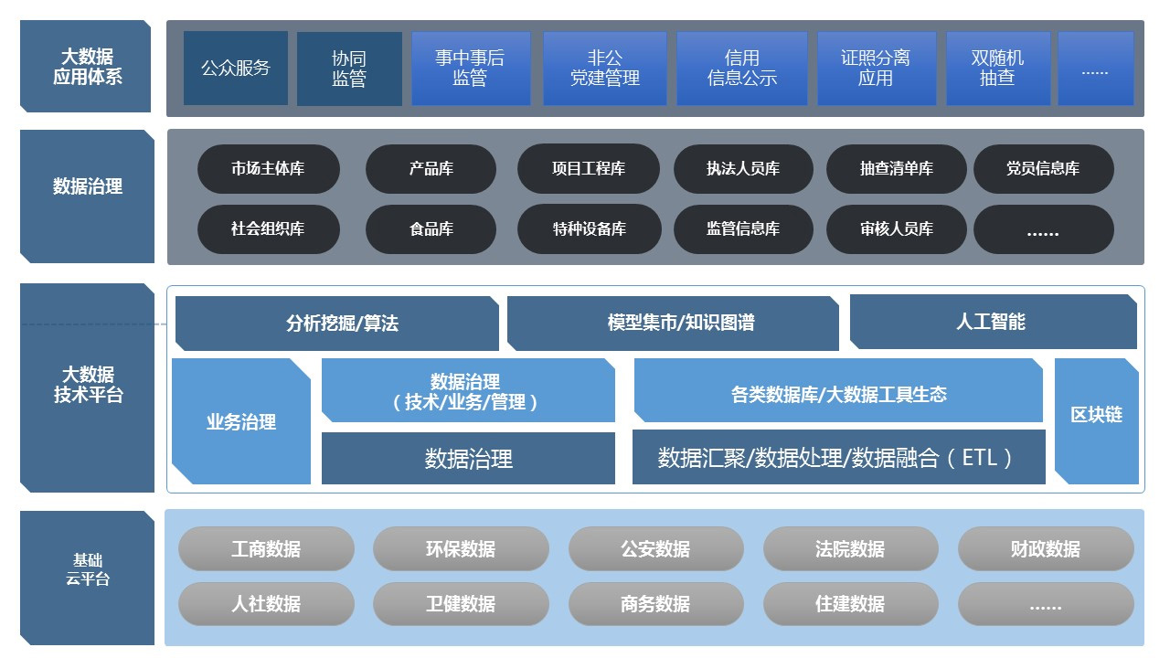 依托互联网,使用“互联网+监管+服务”新模式,解决信息孤岛、信息不对称、效率低下等问题,实现信息推送、信息归集、信息共享、联合监管、联合惩戒、监管共管共治,建立事前告知制度,将监管工作重心从事前审批转向事中事后监管,建立市场主体信用档案,深入开展社会应用,用于政府采购、招标投标、行政审批、政策扶持、资金扶持、资质资格认定、评优表彰、融资信贷等活动中。实现地区监管手段和方式转型升级,形成“宽进严管”监管体系,实施信用监管,构建“一处违法、处处受限”信用约束机制,营造公平竞争市场环境,落实中央“放管服”(放得开、管得住、服务好)改革,有效促进大众创业万众创新,激发市场活力;结合非公党员大量分散在企业,平台已有企业资源等特点,搭载非公党建管理服务平台,实现非公党组织、党员管理及服务,党建工作常态化、数字化、规范化,提升非公企业党组织覆盖率。
